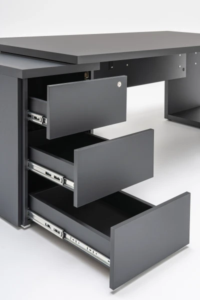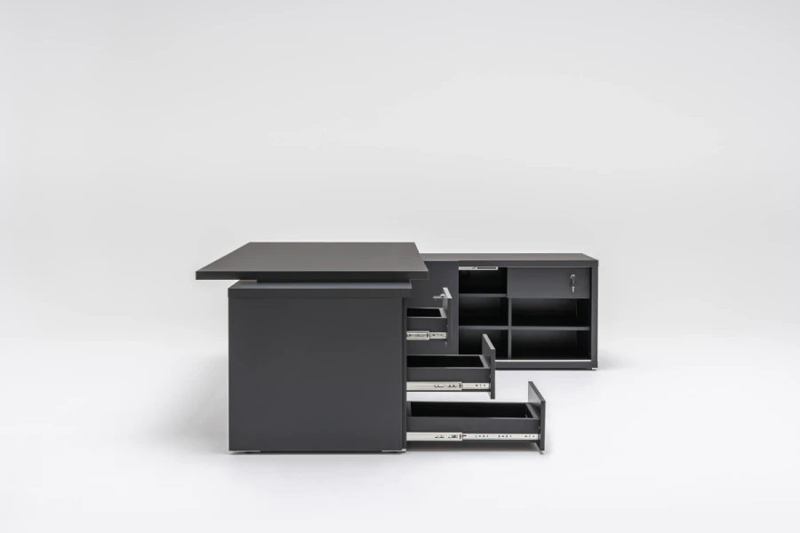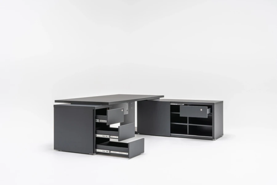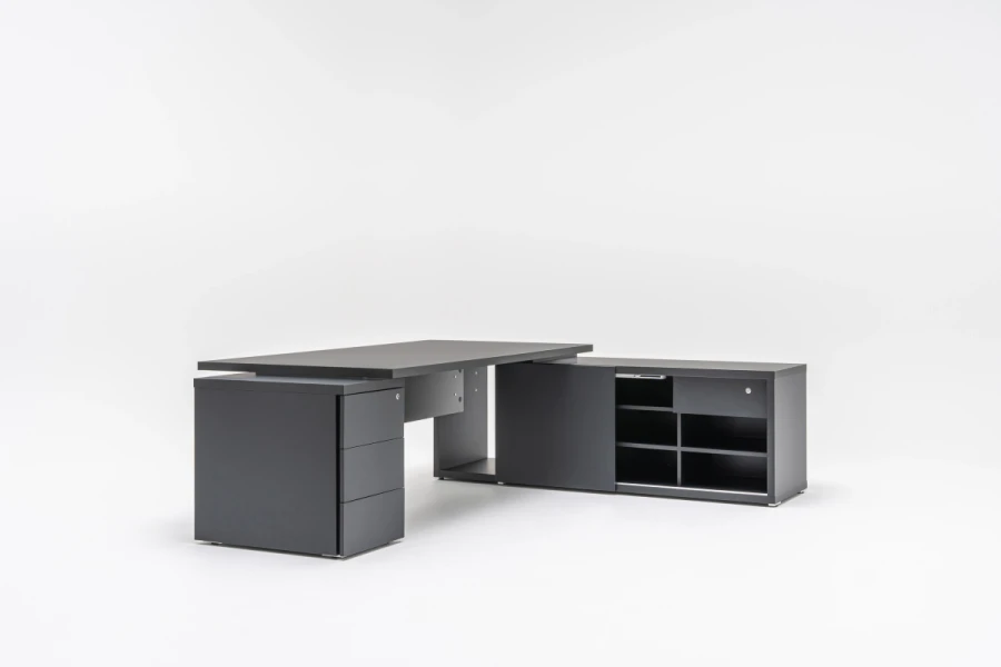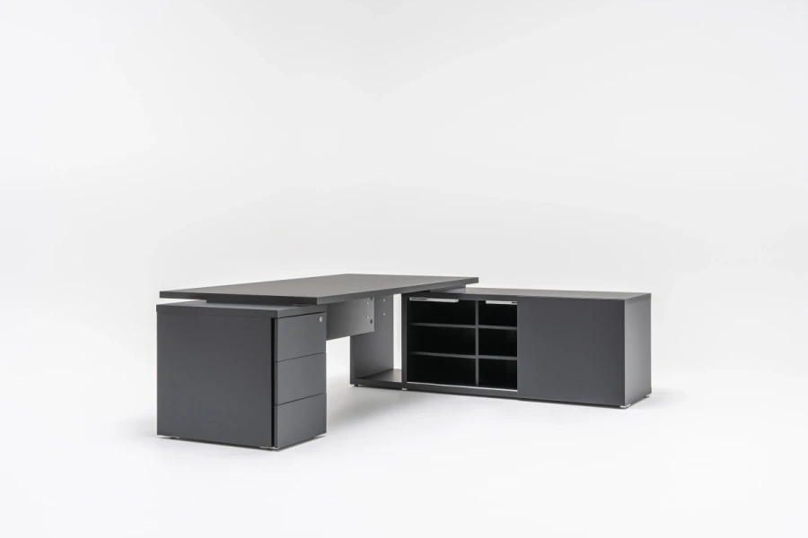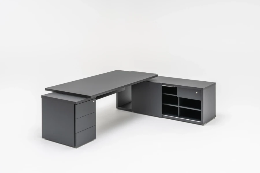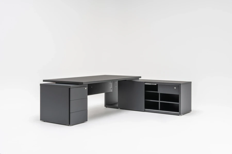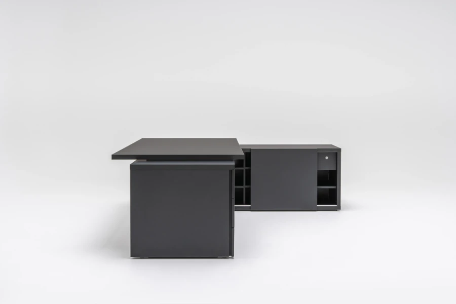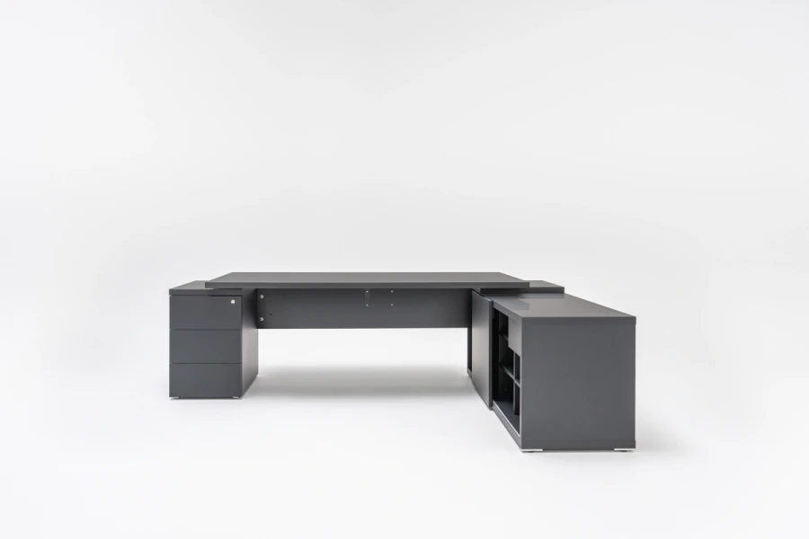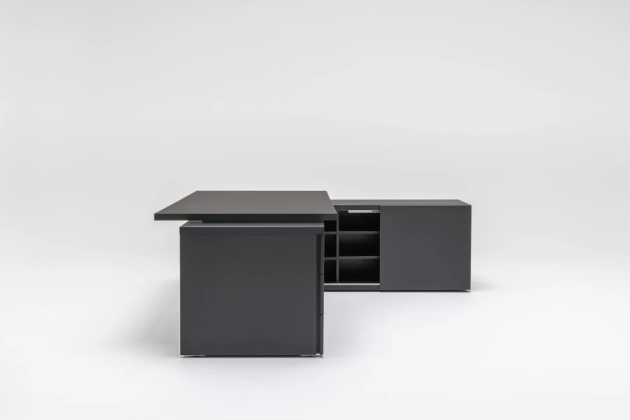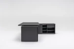 Stôl je k dispozícii v dvoch farbách: jantárový dub a robinia, ktoré možno kombinovať s bielymi a čiernymi matne lakovanými detailmi, ktoré podčiarkujú prestíž kolekcie.