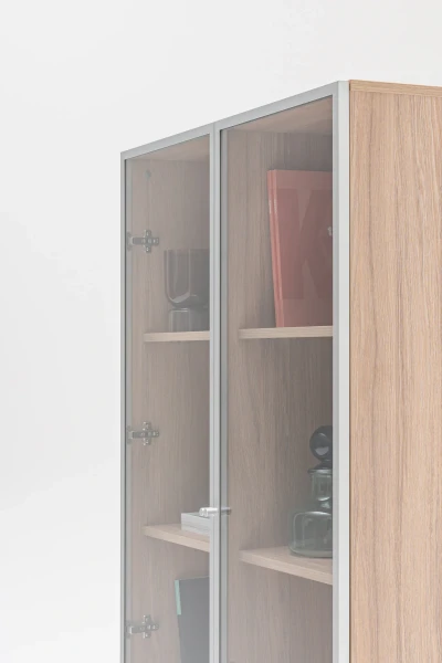 Skrine so sklenenými dverami z kolekcie Mito kombinujú praktickosť s čistým a elegantným dizajnom. Priehľadné dvere umožňujú decentne vystaviť obsah skrine, čím pomáhajú udržať prehľadnosť a zároveň dodávajú priestoru vzdušnosť a sofistikovaný vzhľad.